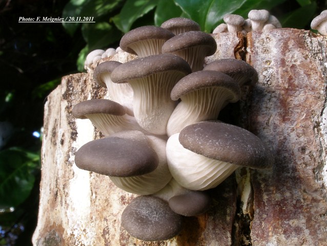 Ce champignon se trouve fréquemment sur les étals des marchés sous sa forme cultivée, mais il est aussi possible d’en récolter lors d’une balade en forêt. Il pousse parfois dès la fin de l’été, mais surtout en automne et même en hiver, sauf durant les périodes de gel. Le pleurote en huître tire son nom de son chapeau très excentré en forme d’oreille, de spatule ou de coquillage d’huître. Ce champignon saprophyte (qui se nourrit de matières organiques en décomposition) pousse en touffes sur les parties vivantes ou mortes des arbres feuillus, plus rarement sur les sapins. Les chapeaux mesurent entre 4 et 20 cm de diamètre. Ceux-ci sont seuls ou superposés et imbriqués, formant un éventail. La cuticule de couleur gris ardoise est beurrée et humide, puis sèche. La marge est fine et enroulée, puis plus ou moins étalée. Les lames serrées et fourchues, d’abord blanches, prennent des reflets crème ou grisâtres. Le pied très latéral est court et épais, voire parfois inexistant, couvert de poils ou fibrilles à l’extrémité. La chair épaisse et tendre dans sa jeunesse dégage une odeur agréable, parfois légèrement anisée. Sa saveur est douce. Le pleurote est un bon comestible à consommer à l’état jeune, car, vieux, il devient plutôt coriace. Il peut être cuisiné seul, dans un mélange de champignons ou même préparé au vinaigre. Il contient, en petite quantité, des composés phénoliques qui se trouvent dans les antioxydants et un acide aminé, l’ergothionéine. Selon plusieurs études, des extraits de pleurote auraient un effet antitumeur sur certaines cellules cancéreuses du corps humain, telles que celles de la prostate ou du côlon. Il est fréquent de trouver sur le même arbre des Panellus serotinus, champignon sans valeur gustative à chapeau de couleur grisâtre un peu jaunâtre à verdâtre. Les lames crème à jaunâtres s’arrêtent de manière nette sur un pied jaune couvert d’écailles foncées. Il y a peu de risque de confusion, mais en cas de doute, contacter le contrôleur officiel de votre région.
